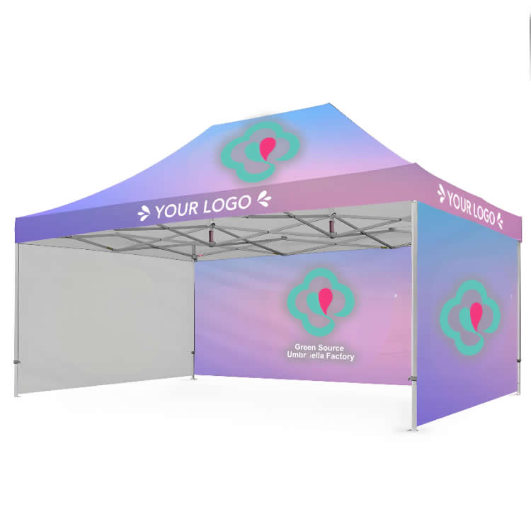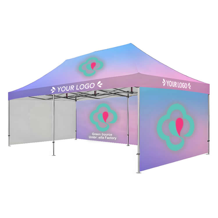 Full roof print – Your logo or pattern covers the entire top. Visible from outside the tent and from above if placed on a mezzanine or second floor. Inks are UV resistant to prevent fading after weeks of sun exposure.