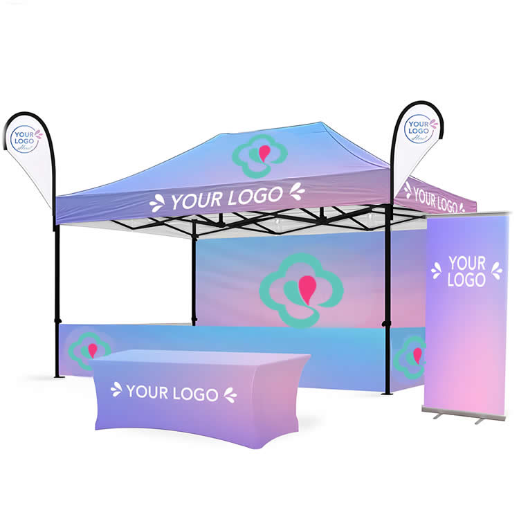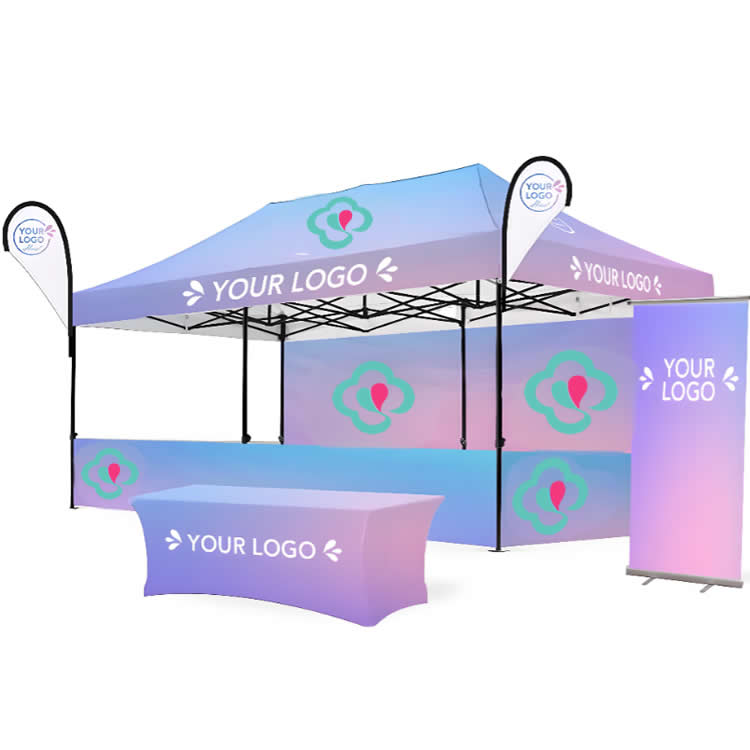 Flags, banner, and table cover use compatible print fabrics matched to your Oxford cloth color so everything looks consistent.